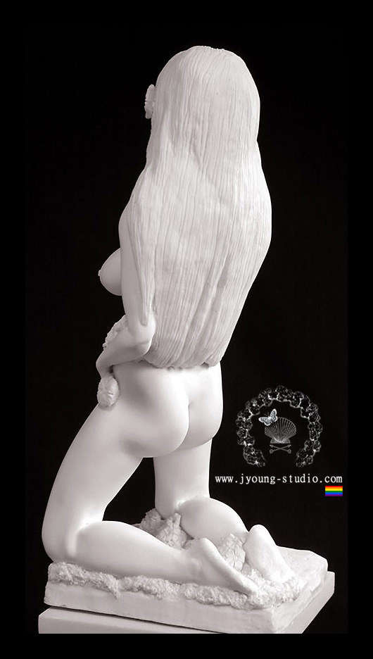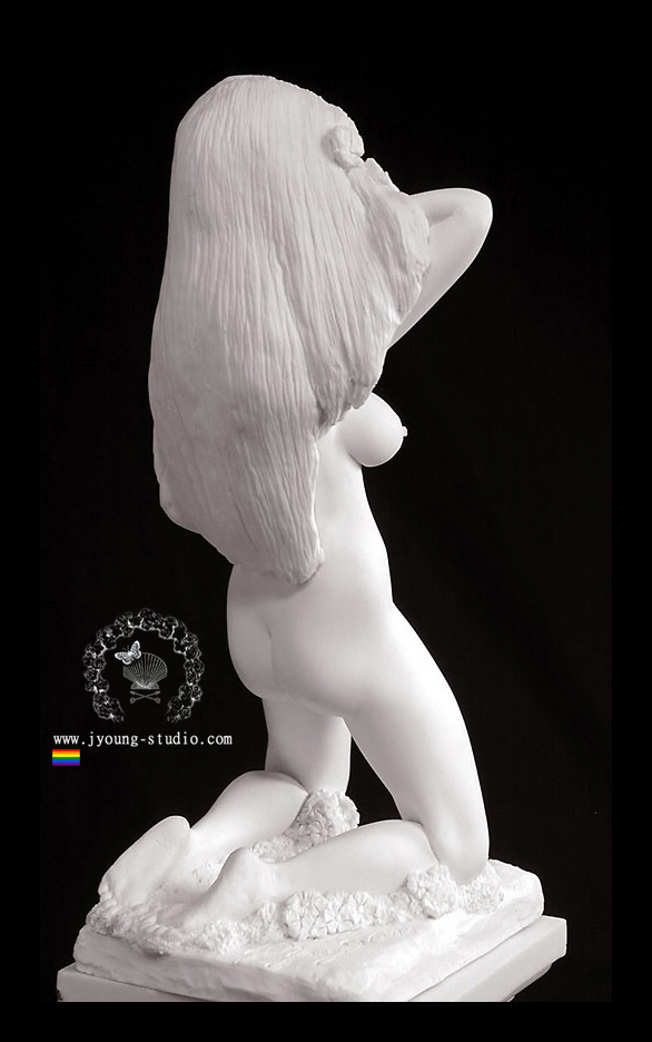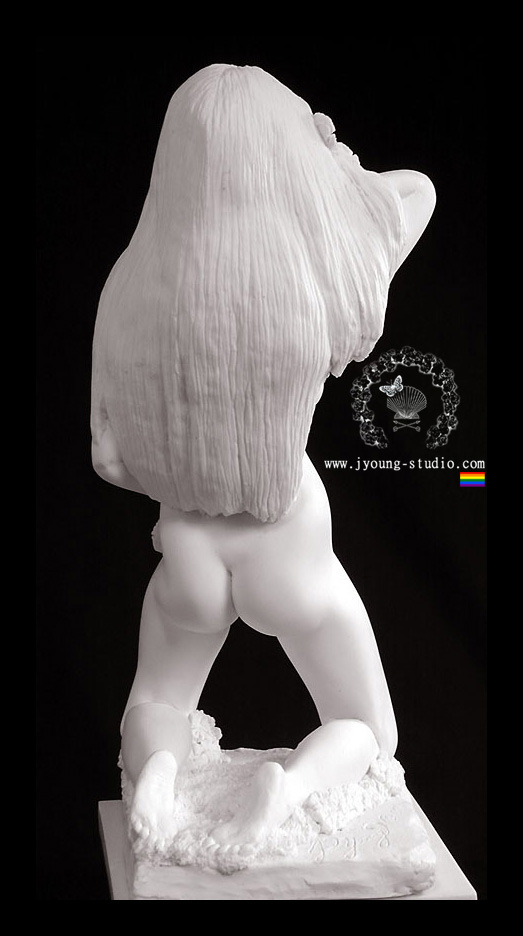 8 inches tall, Off white in color, with a matte finish. Mixed media. Open edition. Signed & dated on the base.